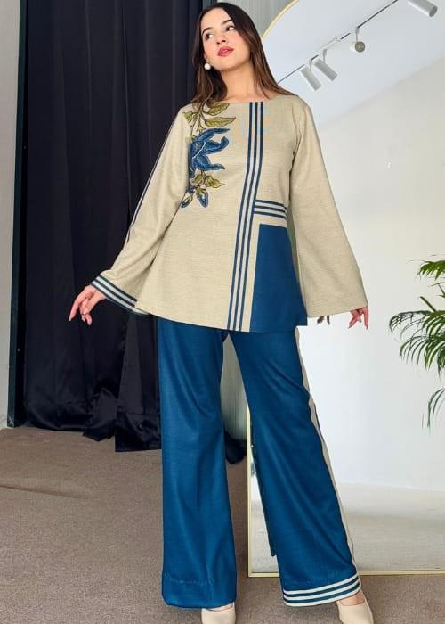A ready-to-wear two-piece co-ord set in soothing blue and skin tones, crafted from soft and luxurious Korean Silk for a smooth, elegant finish. The set features a straight top and matching trousers, designed for effortless style and all-day comfort. Perfect for casual or semi-formal occasions, this co-ord set combines classic simplicity with a contemporary look.