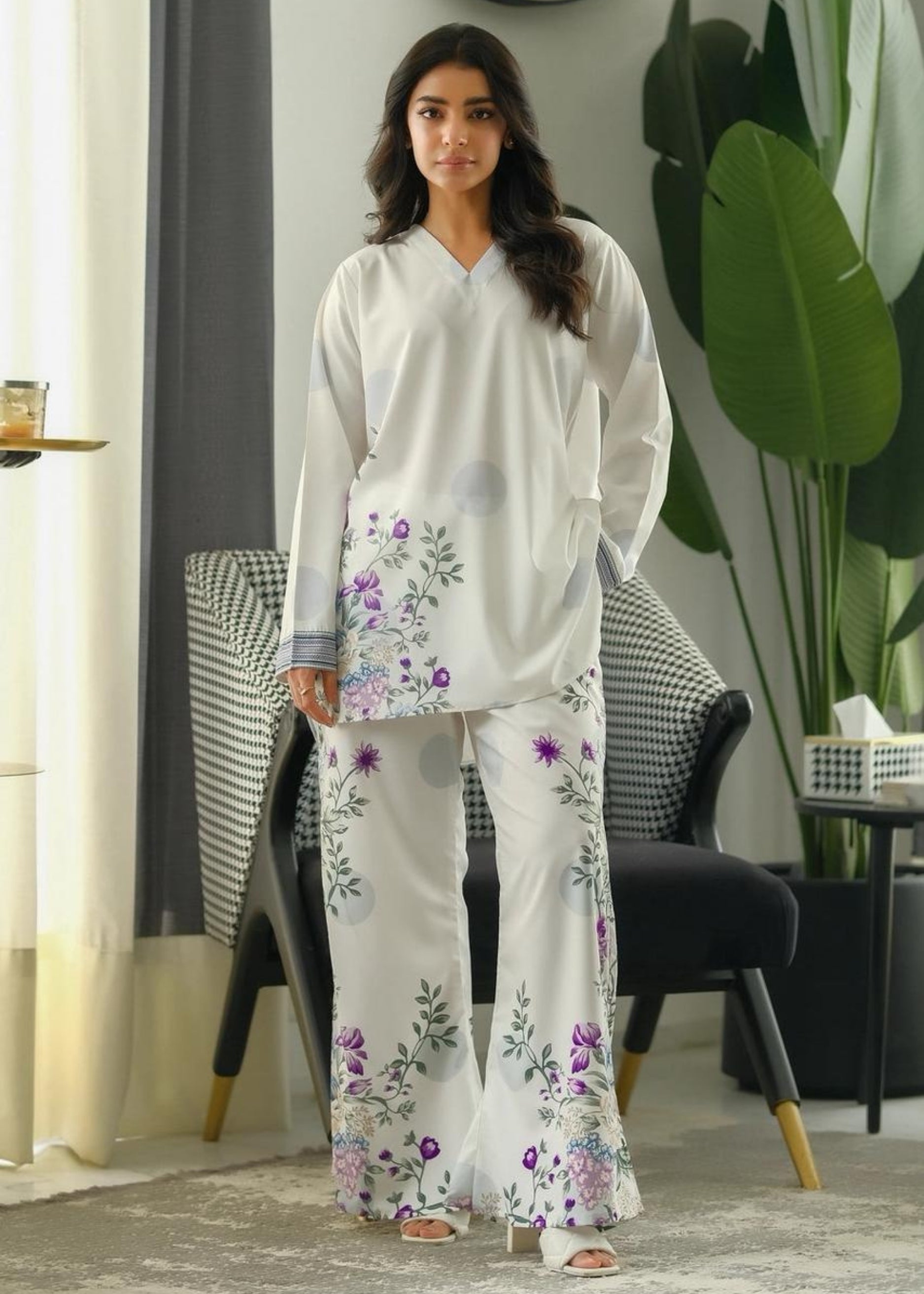 Step into elegance with our Moonlit Flora Co-ord Set, a dreamy blend of sophistication and comfort. Crafted from premium fabric in a soft ivory base, this stitched 2-piece set is beautifully adorned with delicate purple floral motifs and leafy patterns, creating a graceful, feminine look.
